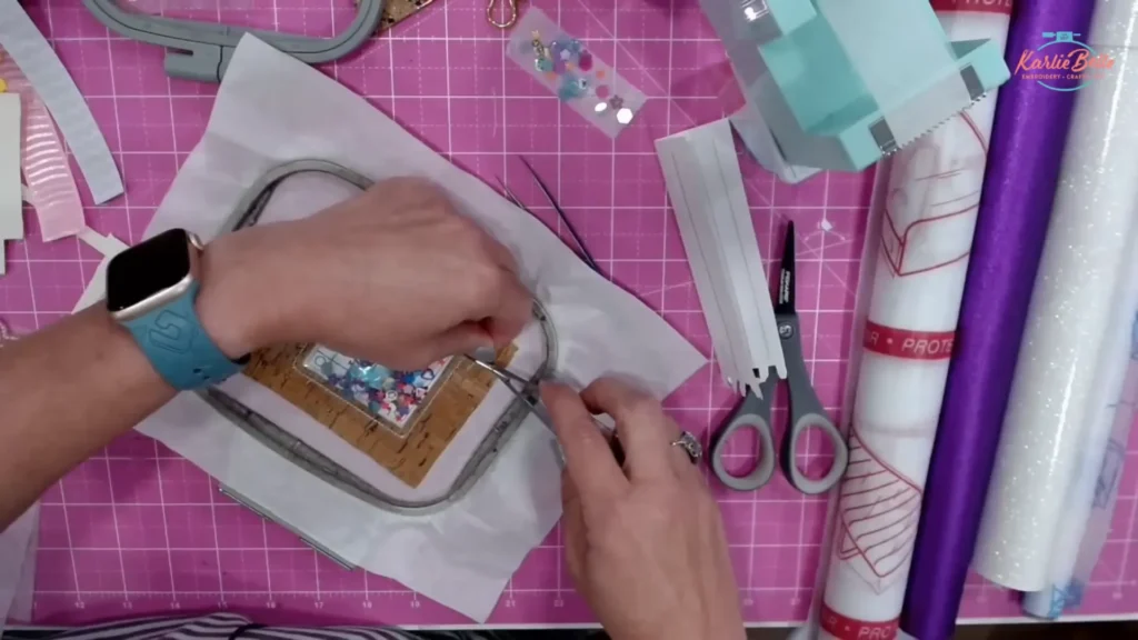 Step 8 — Remove hoop and trim threads before you start the clear vinyl step