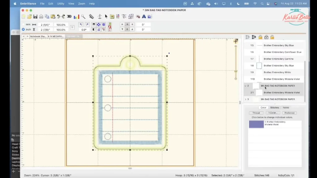 - Add personalization: Use the lettering tool to add a name. Place the name on top of the lines of the notebook design. Move the name step to be stitched before any of the steps that add the clear vinyl or the back so the embroidery does not show on the back side of the tag. Typically put the name right after the lines on the paper and before the confetti clear vinyl step.