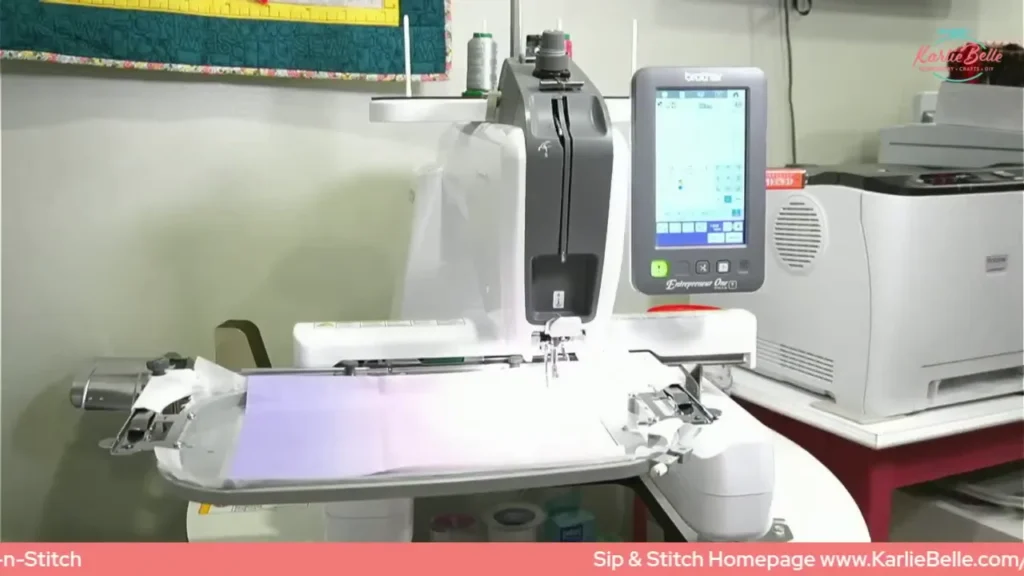 - The machine will stitch a long basting stitch around the entire perimeter next. This is intentionally long so you can remove and adjust if the alignment is not perfect.